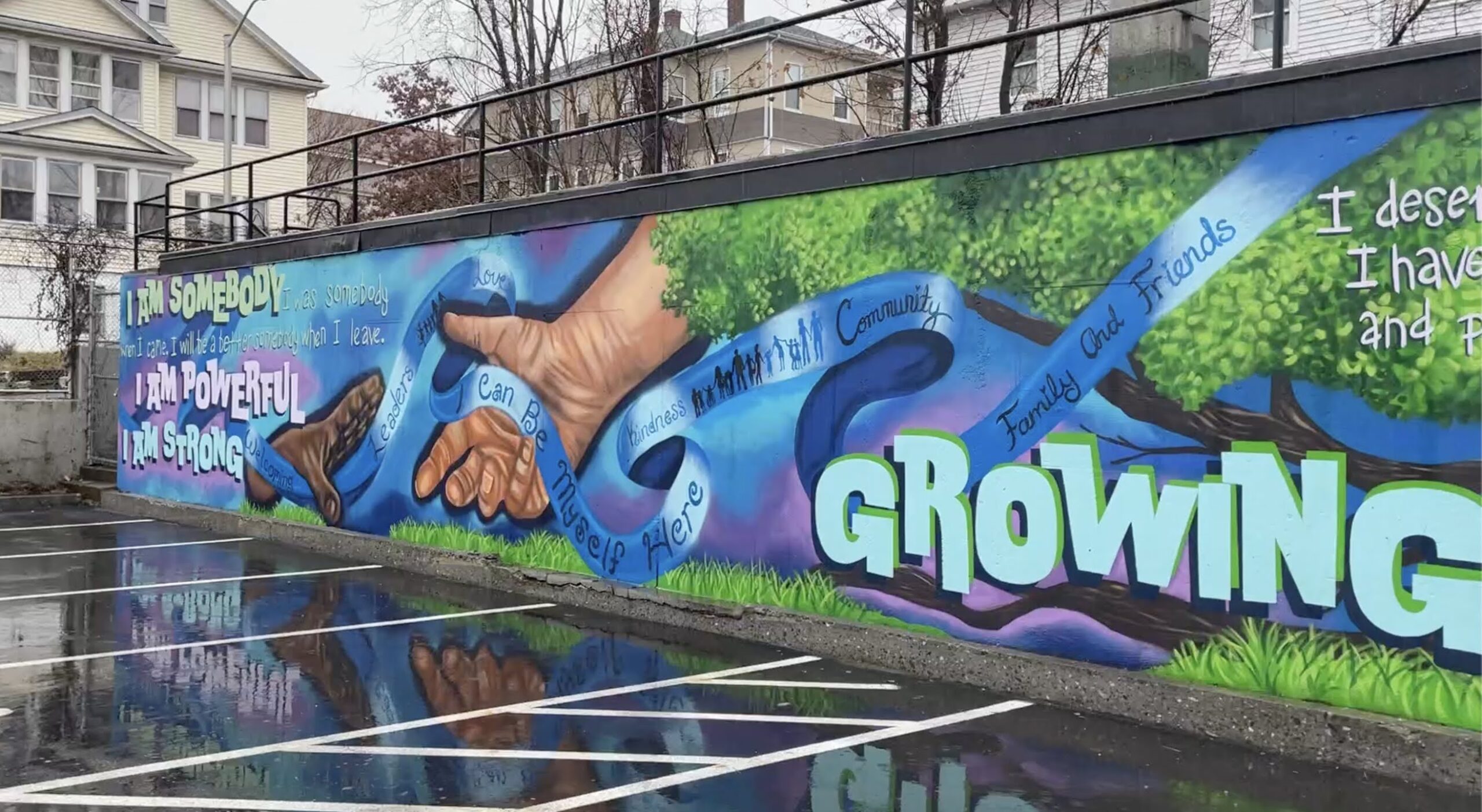 See more photos of the mural HERE! This project is a partnership between Main IDEA Worcester Common Ground. The Lead Artist created a final design based on concepts submitted by youth and community participants of WCG, who held discussions and submitted design entries for the mural with the prompt, “Home;” a Painting Team consisting of 7 youth from WCG worked together to co-paint the design onto a wall at their Community Center, alongside the Lead Artist.